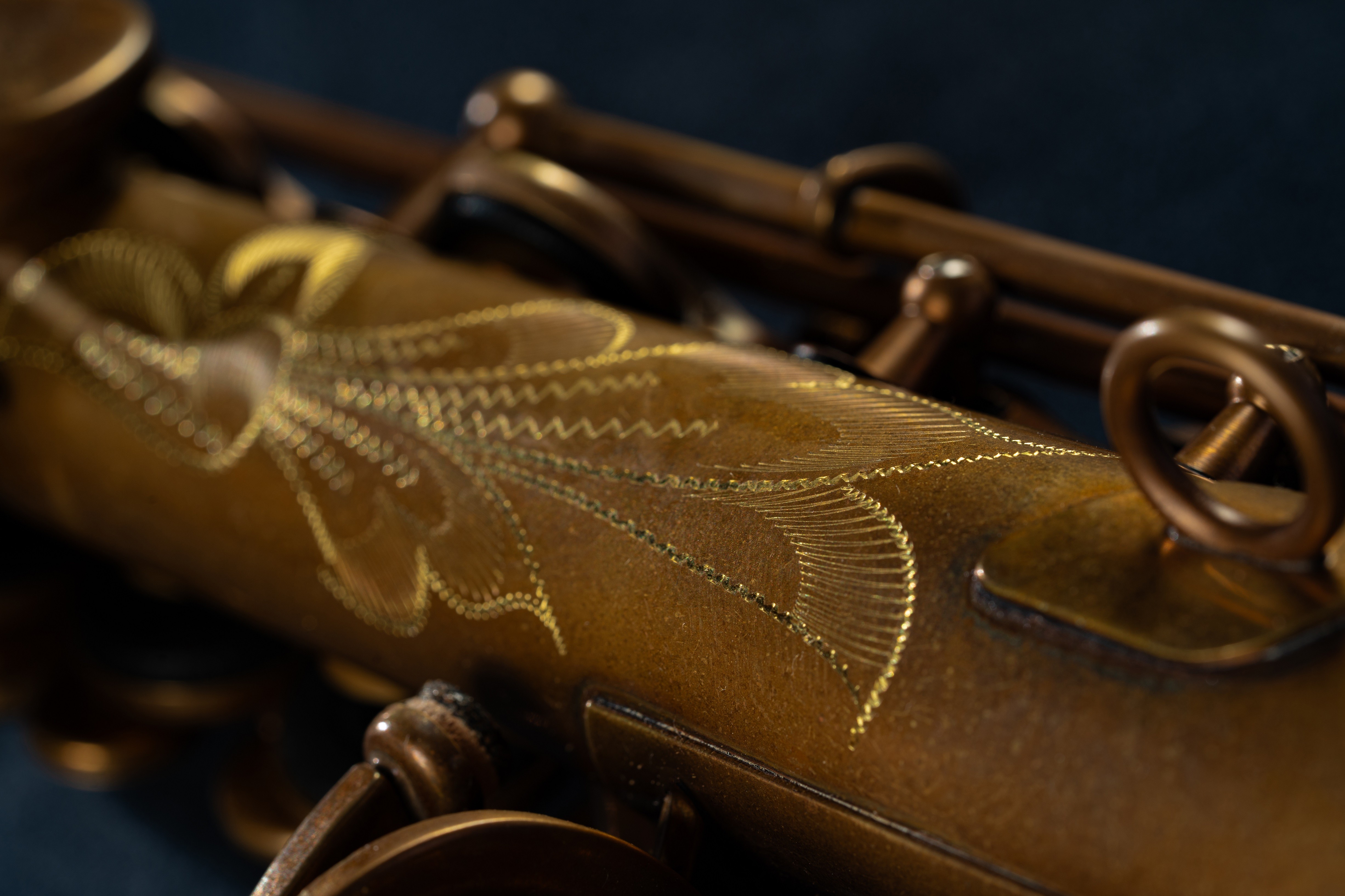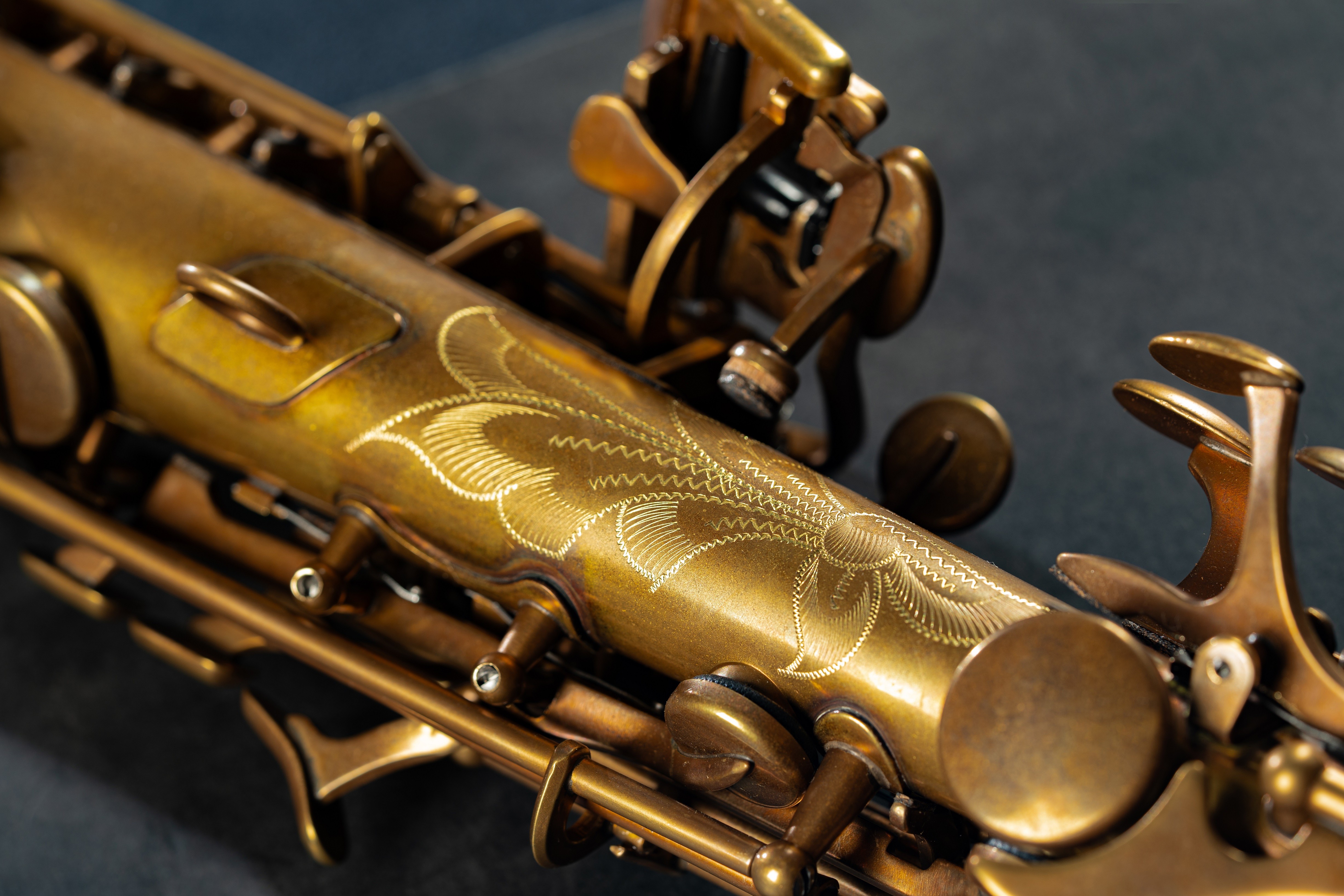 降B调高音萨克斯 出口级黄铜、无铅焊接 R形弯脖倒流设计 太阳花黄铜反射板皮垫 蓝钢弹针 表面裸铜(无漆)漆面 ST11定制皮革箱包 随管附带定制笛头、皮革背带、黄铜哨卡、麂皮擦布、专用软木油、食品级牙垫